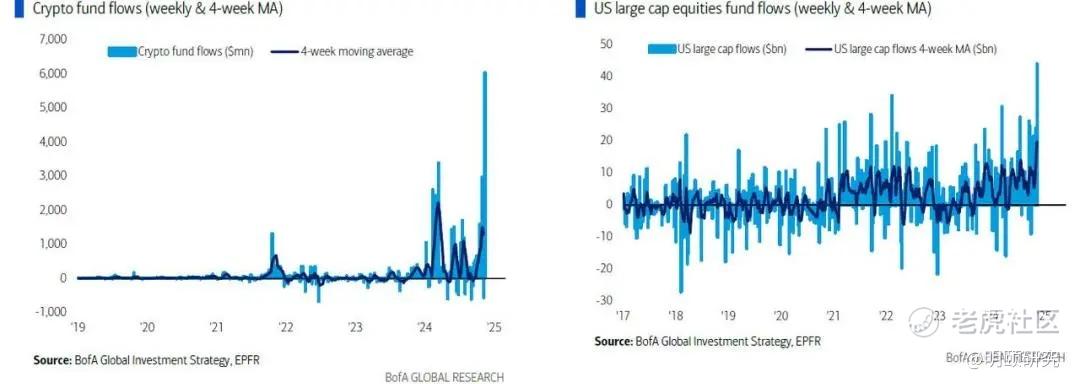 在继续之前,让我们快速看一下最新的每周资金流动情况,在这里我们发现从债券到股票、从新兴市场/中国到美国、从黄金到加密资产的大规模轮换。