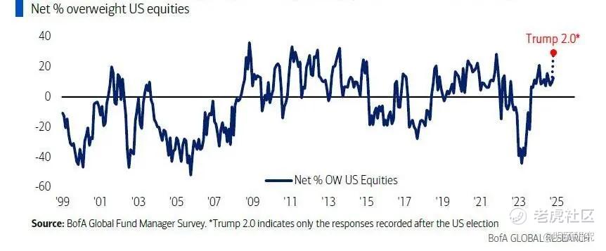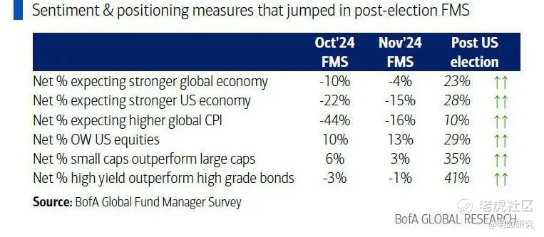 在美银的客户定位中也可以观察到类似的信号:根据11月份的美国银行全球基金经理调查,大选后,投资者对美国经济增长更快、通胀更高、大量增持美国股票(自2013年8月以来对美国的配置最高)的信念发生了巨大变化。