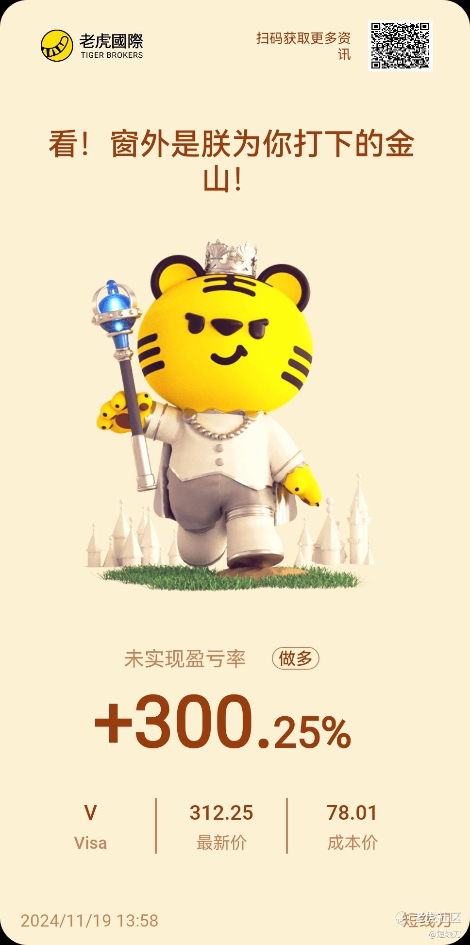 $Visa(V)$ 2016年11月至今,持仓历经整整8年,终于站上300%大关。纪念一下。