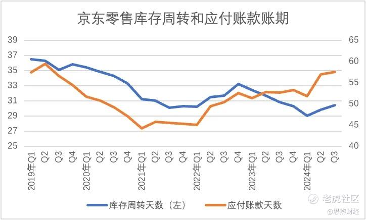 “以旧换新”政策在该季度进行了一轮加力,对于京东要抓住这一机会就需要提高库存规模进行充分备货,以时刻满足用户需求,其后在经营中似乎并没有实现管理层预期(否则库存周转效率应该是稳定的),这也是影响经营性现金流的重要原因,在总需求仍然疲惫之时,尽管可以通过账期等指标调节企业沉淀资金的能力,但营收增速变缓时,上述能力就收到极大制约。