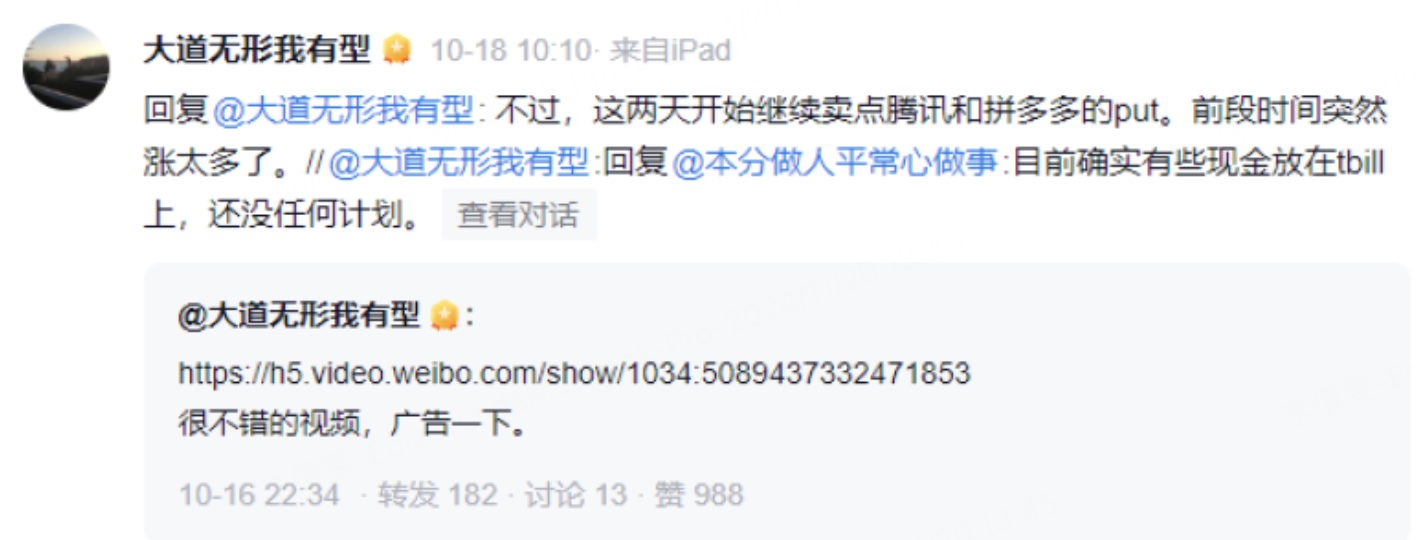 10月18日,段永平再表示:“这两天开始继续卖点腾讯和拼多多的put。前段时间突然涨太多了。”