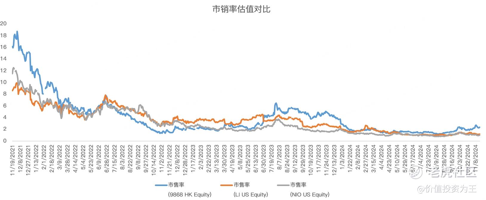 其次,由于小鹏mona03和P7+销量大增,股价已经提前反映,最近一段时间的走势明显强于竞争对手。由此带来估值较高的问题,如从市销率来看,小鹏为2.4倍,明显高于理想的1.2倍和蔚来的1倍: $蔚来(NIO)$
