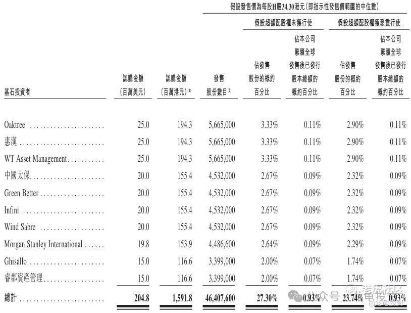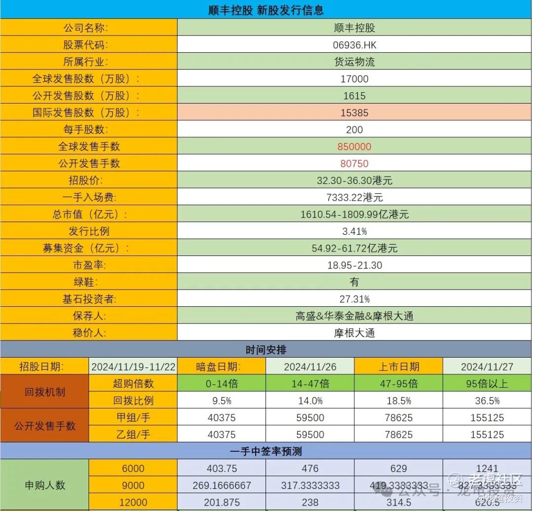 顺丰控股快递行业龙头公司,下限定价A/H溢价率34%,上限定价溢价率20%,这种世界500强企业质地不必多说;资金方面本次总共引入10位基石投资者,认购金额2.048亿美金,约合15.94亿港元;本次募集资金54.92-61.72亿港元,减去基石锁定份额,流通值38.98-45.78亿港元;