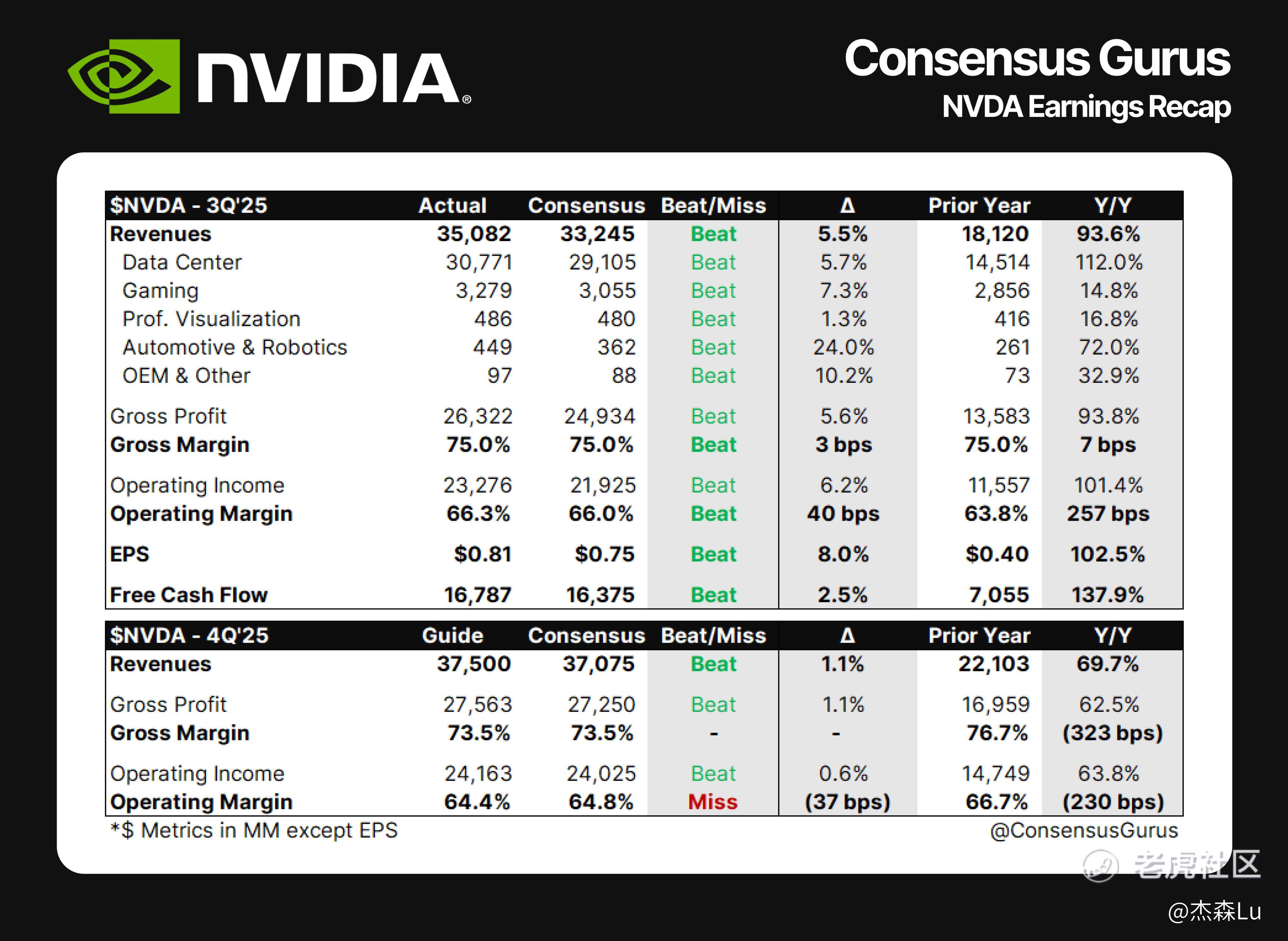 英伟达(NVDA)刚刚公布了2025财年第三季度财报,关键数据全面超预期: