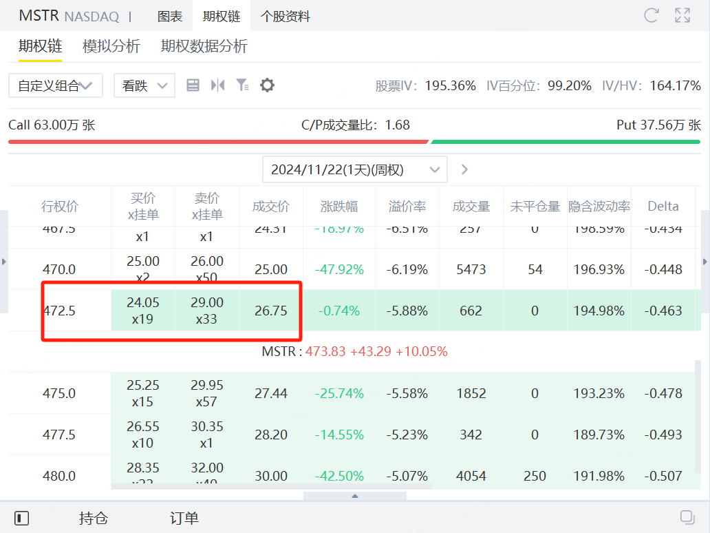 看多MSTR的投资者可以卖出到期日为11月22日,行权价为472.5的看跌期权,获得权利金2675美元。