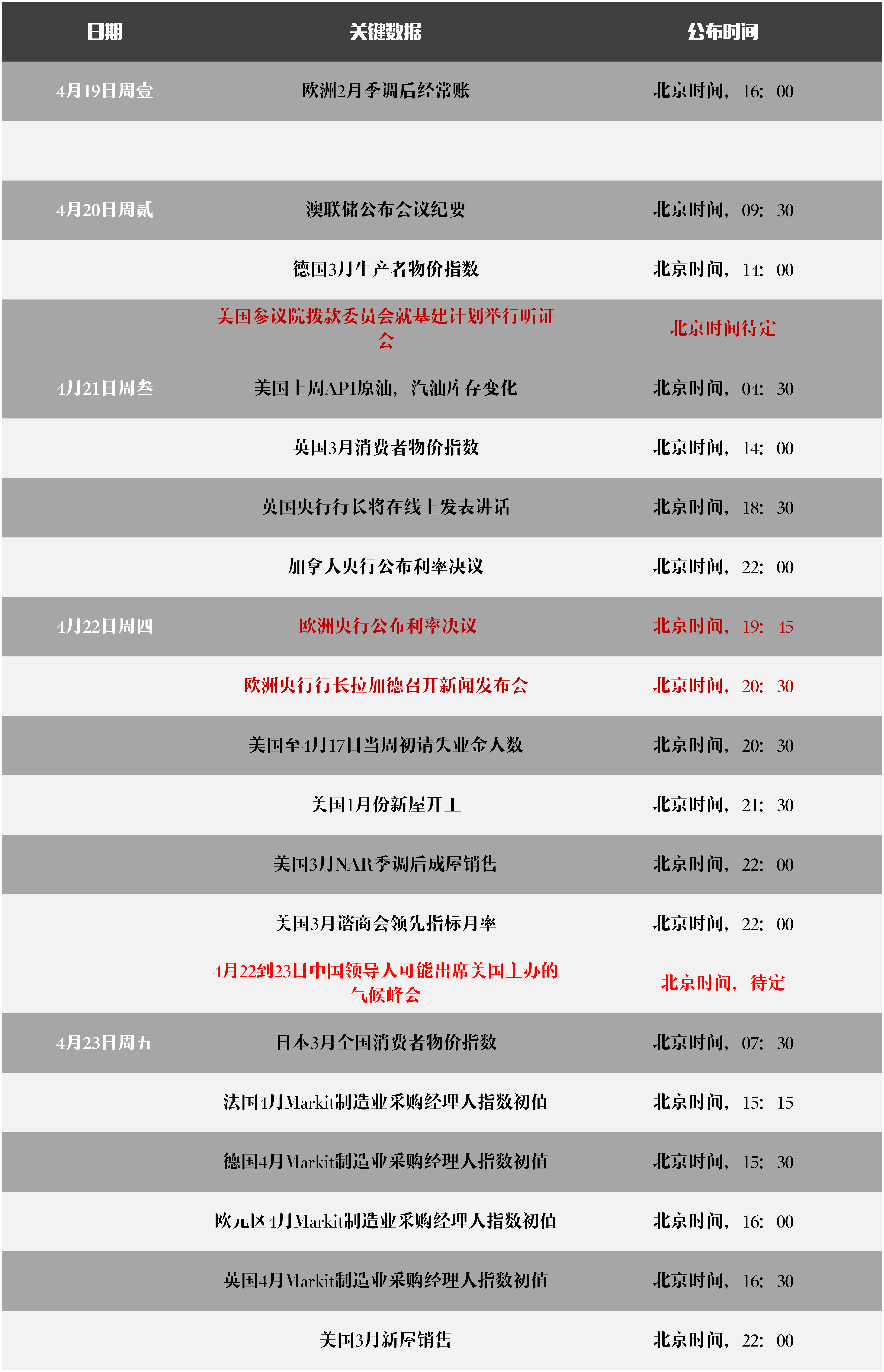首先,来看下我们本周需要关注的数据和大事梳理,其中22日到23日的领导人气候峰会将是重中之重: