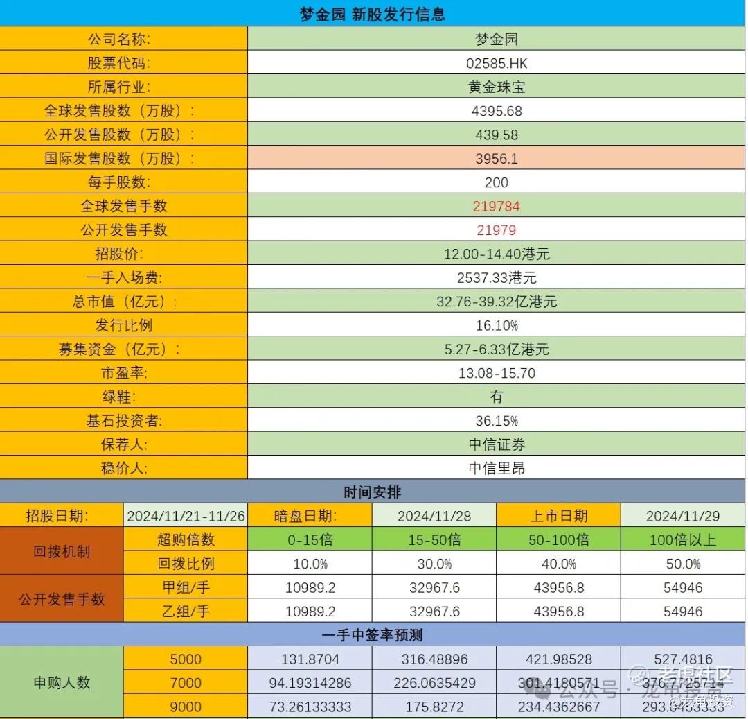 本次募集资金5.27-6.33亿港元,基石锁定2.11亿港元,流通值3.16-4.22亿,当时老铺黄金都只有3.5亿,各项数据对比看下来,梦金园给我的感觉都是不值得申购,唯一能拿出来说的也许就是中信证券保荐这个事了吧!又去看了下中信证券今年的几个小市值票,都是玩儿套路回拨的套路在玩儿,这票我还是保持一致性,以基本面为准,就不参与了,不能吃肉的时候没参与,挨打的时候上赶着。