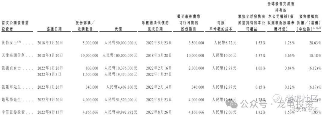 公司IPO前多位投资者参与投资,最后一位IPO前投资者中信证券投资完成于2022年8月,代价4999万人民币,每股成本12元人民币,较发售价折让1.83%,禁售期12个月。