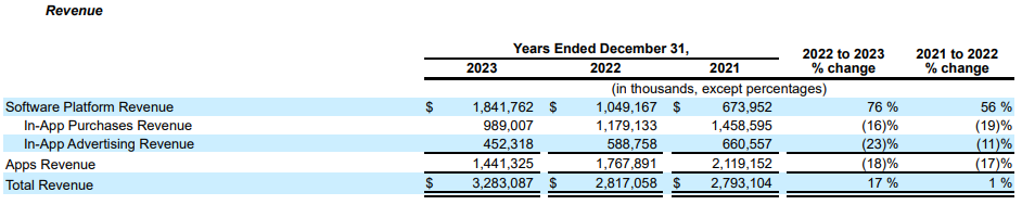 而Applovin的发展,也跟其战略倾向有关,可以看到公司本身也是一个有大量app应用的软件公司,但这几年自营app业务的内购还是广告收入都在下降。而平台收入增加,可以说,公司作为软件公司的功能正在消退。