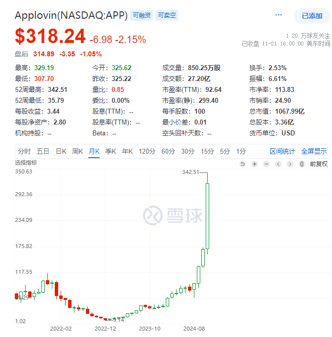 随着硬件股票整体业绩预期已高,难再有大惊喜,这些应用股也被视作是下一回合的Ai投资核心标的,会延续英伟达的爆发行情。Applovin跟palantir并驾齐驱,已经成为了最火热的Ai股,而在中国市场,映射的标的也从硬件算力,切换到了Ai应用股票上。当下,还是要理解一下,Applovin会不会像英伟达一样行情持续两年,且后续还有哪些预期的空间。
