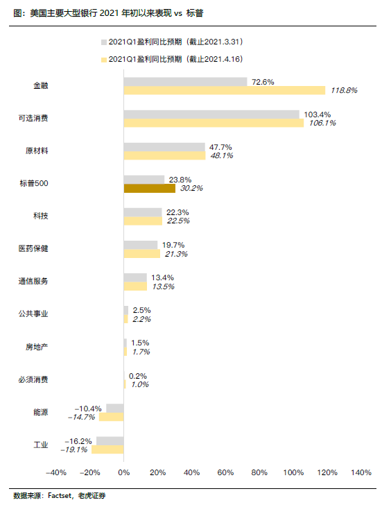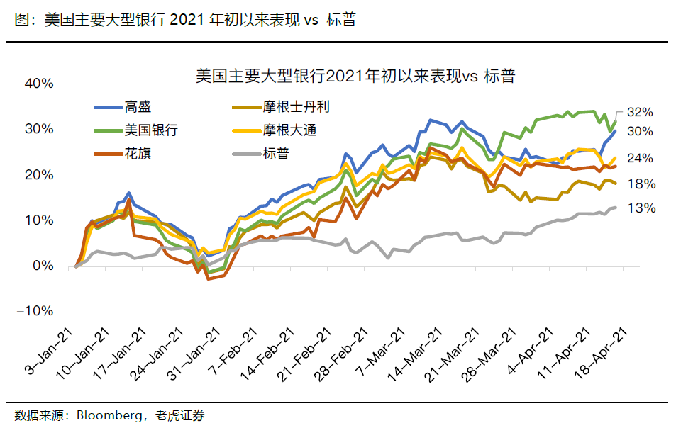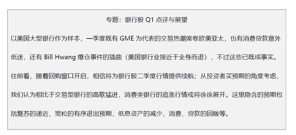 以美国大型银行作为样本,一季度有GME为代表的交易热潮席卷欧美亚太,也有消费贷款意外低迷,不过这些已既成事实。往前看,从投资者买预期的角度考虑,我们认为相比于交易型银行的高歌猛进,消费类银行的追涨行情或将徐徐展开。