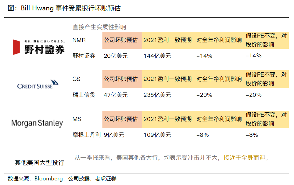 如果我们假设PE不变的话,那么Archegos基金爆仓对$瑞士信贷(CS)$股价的影响大致在20%附近(大约对应10.3美元),我们看到,截至4月16日盘前,瑞士信贷的股价已经计入了这部分预期。考虑到$野村控股(NMR)$和瑞信已经计提了大部分,基于此,我们可以理解为美国银行业接近于全身而退。