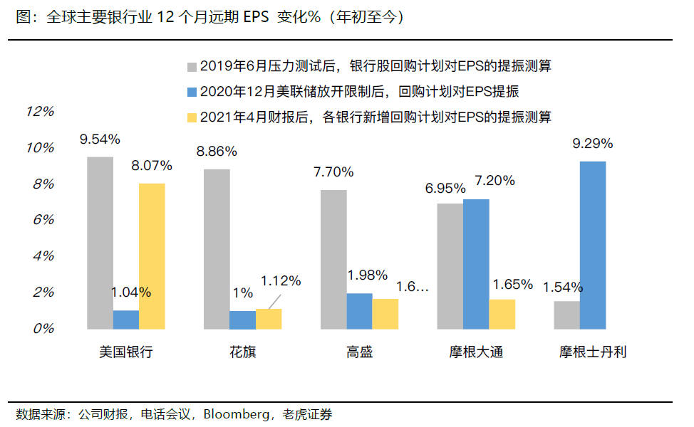 我们再从2020年底之后的回购情况看(下图,蓝色和黄色柱),华尔街五大行中,$美国银行(BAC)$ 、$摩根大通(JPM)$ 、$摩根士丹利(MS)$ (一季度时期给出了2021年的回购计划)为回购力度较大的银行。