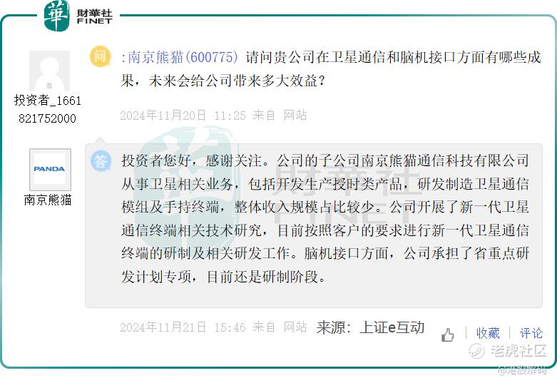 近日,南京熊猫在投资者互动平台表示,脑机接口方面,公司承担了省重点研发计划专项,目前还在研制阶段。