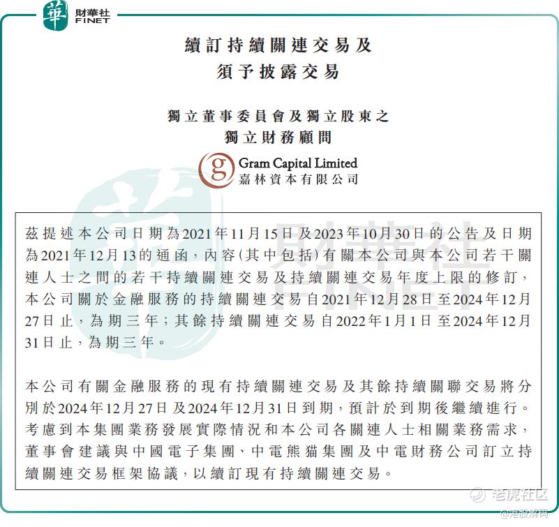 11月24日,南京熊猫发布公告称,公司拟与中国电子集团、中电熊猫集团及财务公司续订了未来三年的持续关联交易及年度上限。这些交易将包括分包服务、销售物资及零部件等,旨在为公司提供稳定的收入来源,并提升“熊猫”品牌的知名度。