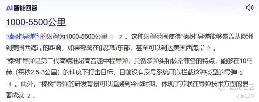 按照大鹅方面的说法,这是一枚名叫"榛树"的试验新型中程高超音速导弹,速度可达10马赫。不过西方的媒体普遍认为,这就是一枚洲际导弹。我直接替你们问了一下AI,上面的内容各位可以自己去学习。