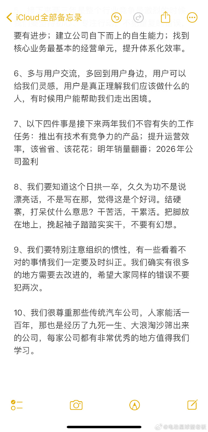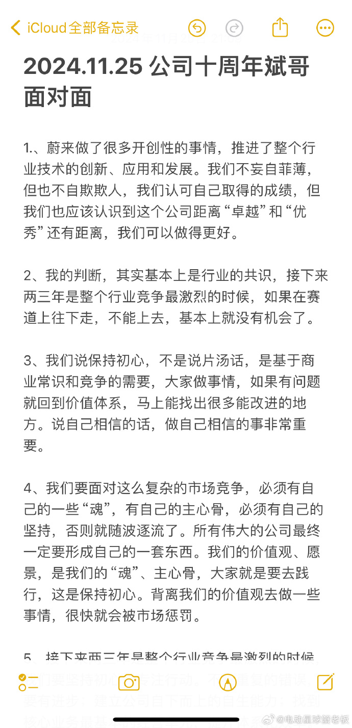 刚才看到了李斌十周年内部面对面的 10 点小抄,跟内部公开信相比,有一些更细的内容。具体内容,如图。我快速说说自己看完后的两点想法。 $蔚来(NIO)$ $蔚来-SW(09866)$ $蔚来(NIO.SI)$