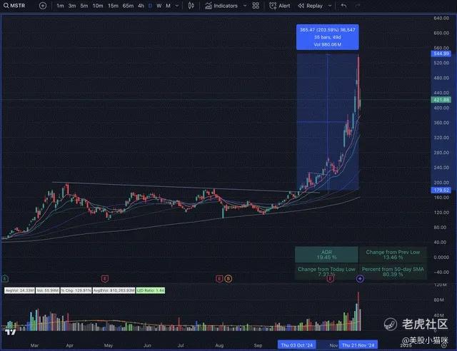 短期来看,比特币可能即将迎来休整迹象。首先,比特币已远离50日均线(SMA)约32%。其次,MicroStrategy (MSTR) 作为比特币的主要代理股票,经历了50天内超过200%的大涨后出现了典型的“冲顶”形态。