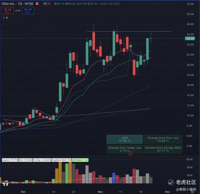 OKLO的走势非常剧烈,从9月至10月经历了约400%的峰值到谷值波动。然而,自那以来,它似乎开始形成类似供需水平的形态,但目前我对这一水平的定义信心不足,希望看到更明确的信号后再考虑买入。