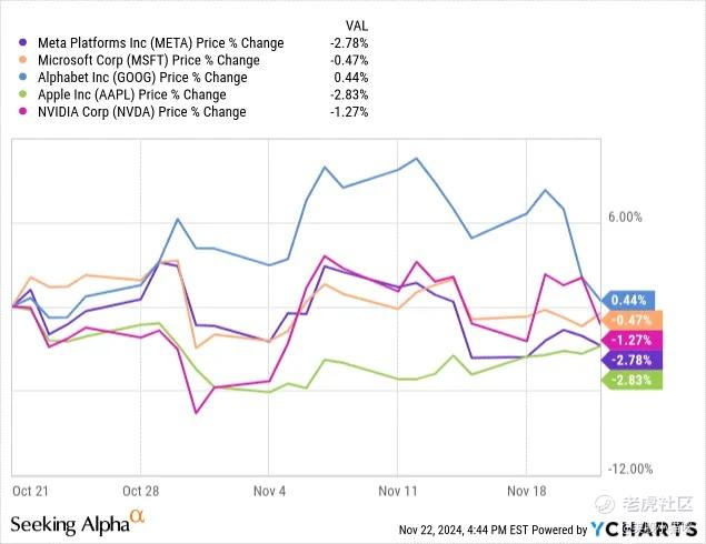NVIDIA (NVDA) 在财报发布后的表现,或者说缺乏表现,可能正是这一趋势的体现。财报发布后该股几乎没有什么动作,当天仅上涨约0.5%。其他FAANGM股票在过去一个月的表现也同样平淡无奇: