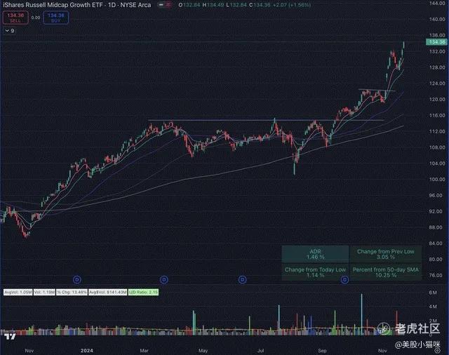 回到中盘成长股(IWP)的日线图,可以更清晰地看到其杯柄形态。IWP已经形成并突破了第一个延续旗形(第二条浅蓝线)。从旗形的突破走势非常强劲,但目前距离50日均线(SMA)超过10%,可能需要一段时间来调整。