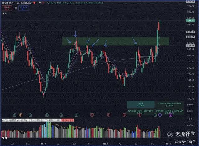 特斯拉已经成功突破了此前多次尝试但未能成功的巨大阻力区,目前似乎正在其上方构建基底。以下是周线图: