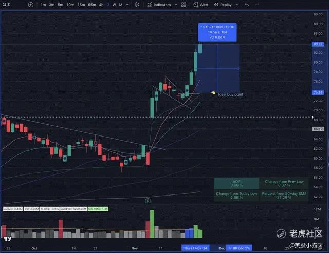 我一直在思考如何为读者实时突出好的买入点。例如,尽管我在之前的报告中将Zillow(Z)列入观察名单,但无法实时提醒其在本周二形成完美买入点。目前股价已从适当买入点上涨约13%,此时已不适合新建头寸。