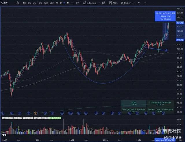 回到中盘成长股(IWP)的日线图,可以更清晰地看到其杯柄形态。IWP已经形成并突破了第一个延续旗形(第二条浅蓝线)。从旗形的突破走势非常强劲,但目前距离50日均线(SMA)超过10%,可能需要一段时间来调整。