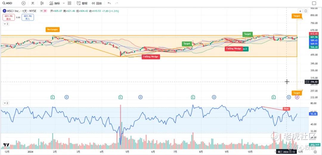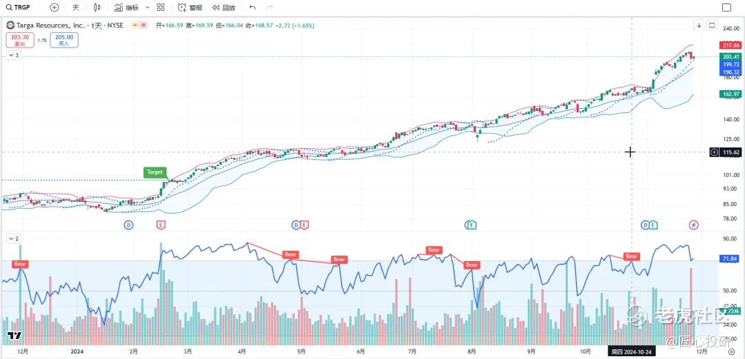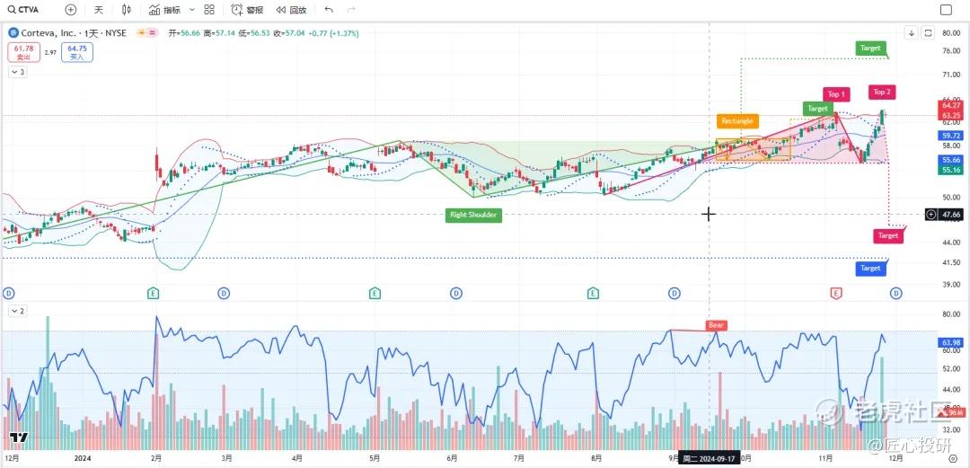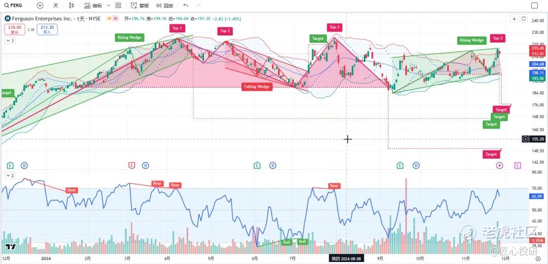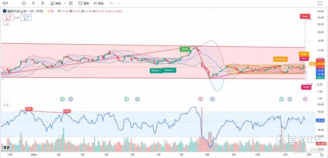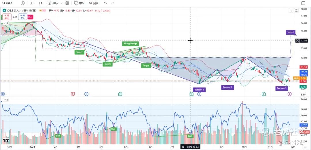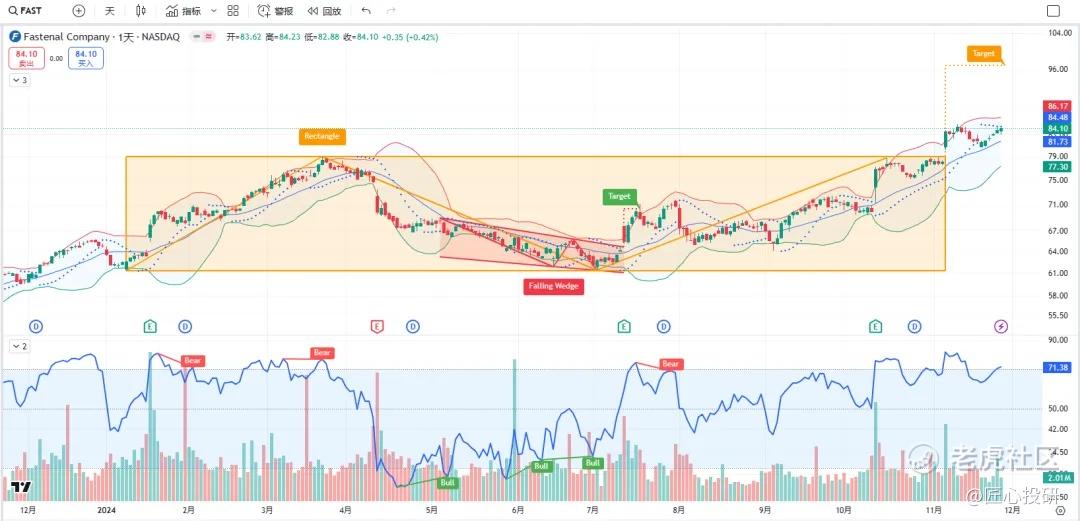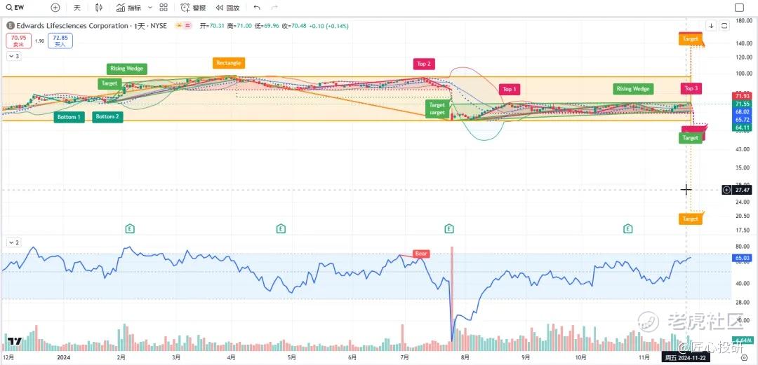 关于目标价:图中标注的“Target”是对应形态的理论目标价位。请注意,目标价并不保证100%达成,有时也可能失效。(内容比较多,图中没有Target的代表无形态,如果没有特殊说明,那就是无形态无目标价)