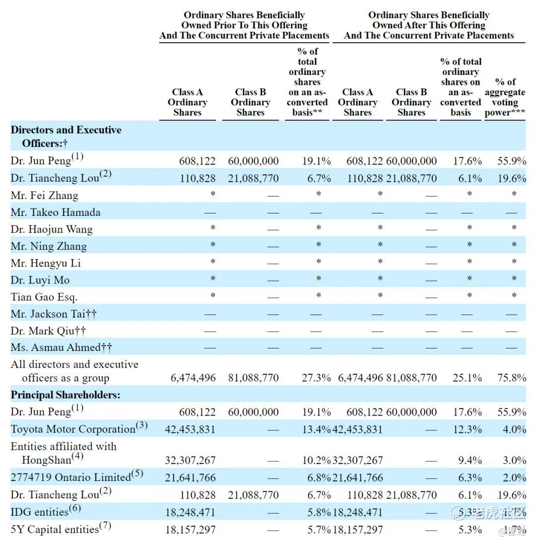 IPO后,彭军持股17.6%,有55.9%的投票权;楼天城持股为6.1%,有19.6%的投票权;丰田持股为12.3%,有4%投票权;红杉中国持股9.4%,有3%投票权;加拿大安大略省教师退休基金会持股6.3%,有2%投票权;IDG资本、五源资本分别持股5.3%,有1.7%投票权。