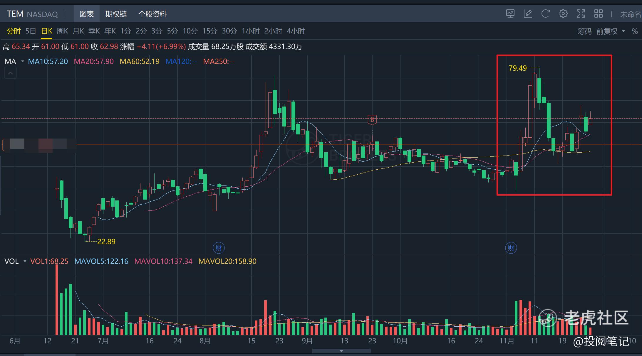 TEM从11月4日开始每天股价大幅波动,大部分时间涨跌幅都在10%左右,目前市值为99.16亿。