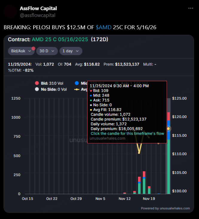 还有重量级传闻——说是佩洛西买了1200多万25年到期的call。AMD年初至今跌幅4%,但凭借MI300芯片,也是在布局和英伟达的竞争。(可能逆势加仓就是在押AMD的长期价值?)