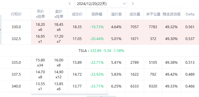 12月7日, $特斯拉(TSLA)$ 的市场价为334,当投资者认为短期内特斯拉可能短期股价不会大幅波动或者轻微下跌,但长期仍看好特斯拉时,投资者可以选择对角牛市价差策略。