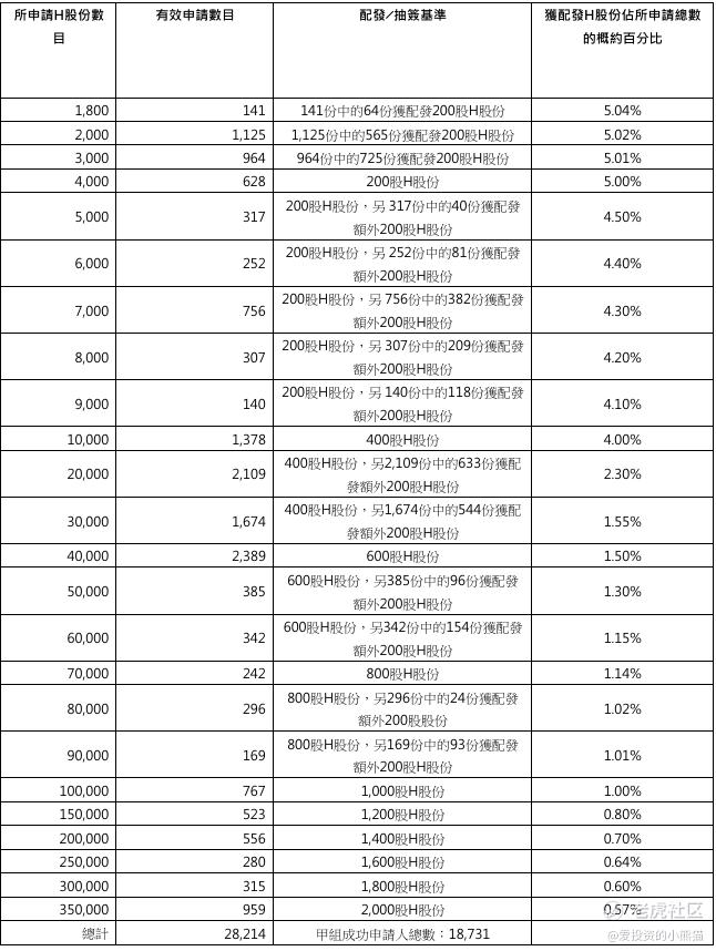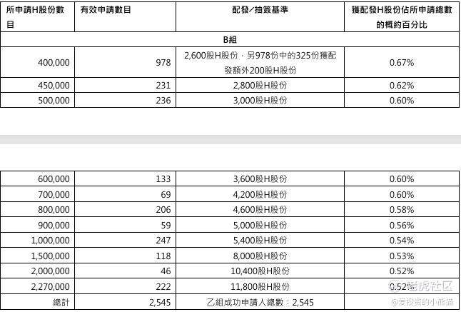 九源基因(02566.HK)的乙组官方披露的中签名单里有653人中签2600股,有556中签2800股,有236人中签3000股,有133中签3600股,有69人中签4200股,有206中签4600股,有59人中签5000股,有247中签5400股,有118人中签8000股,有46中签10400股,有222人顶头槌申购中签11800股。乙组总共中签1134.96万股,货值1.41亿港元。