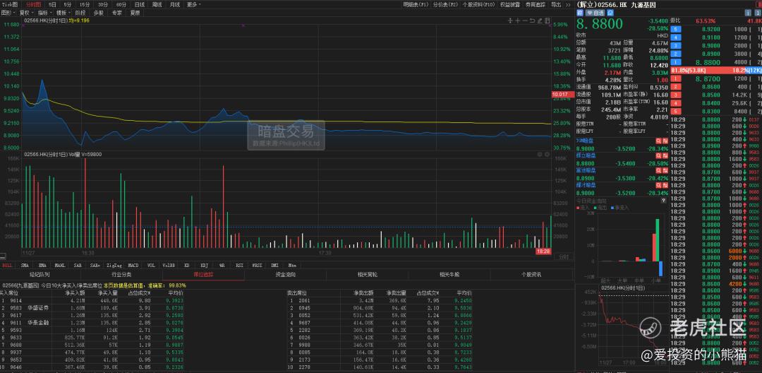 九源基因(02566.HK)辉立暗盘以最高价11.68港元低开,迅速跌到最低点8.60港元后企稳,反弹到9.60港元附近回落,横盘震荡,尾盘以8.88港元报收,跌幅28.50%,振幅24.80%。