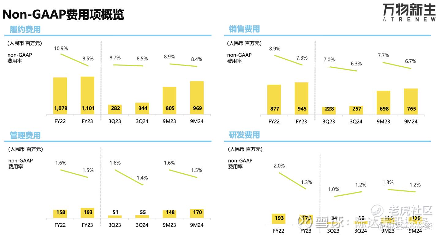 你拉长五年时间,就能看出这家公司在规模效应和精细化管理双重驱动下,non-gaap费用控制上做得有多好:1)履约费用主要包括平台运营、运营站、线下爱回收门店和仓储运营发生的费用及发货运费。通过自动化和团队提效等手段,把履约费用率从 2019 年的 16.7%下降到 2024Q3 的8.5%;2)销售及营销费用,主要包括平台推广费用、渠道佣金、以及参与营销活动的人员的工资和相关费用,销售及营销费用率从 2019 年的 9.5%下降到2024Q3 的 6.3%;3)一般行政费用,包括一般公司职能的人事相关费用,相关费率从 2019 年的 3.6%下降到 2024Q3 的 1.4%;4)技术及内容费用,主要包括设计、开发和维护技术平台,大数据和云技术等技术和内容员工的相关费用以及技术基础设施成本,技术及内容费用率从 2019 年的3.5%下降到2024Q3的1.2%。