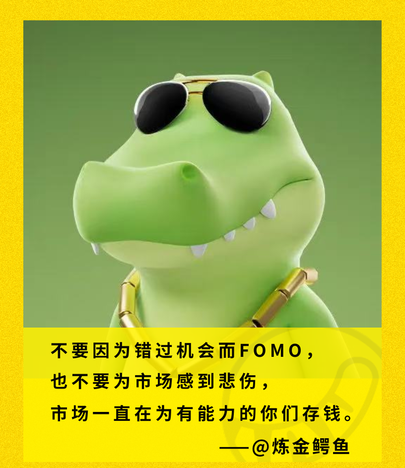 多专注自身交易系统,多去复盘,多在可接受范围内小额试错,并通过学习让交易系统不断进化(不要因为错过机会而FOMO,也不要为市场感到悲伤,市场一直在为有能力的你们存钱)。过滤掉不属于自己的噪音,一起共赴稳定盈利之路。
