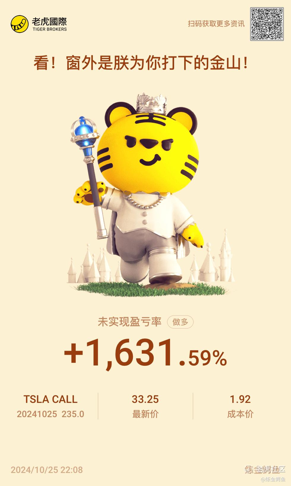 各位虎友们好!本周与我们分享的虎友是 @炼金鳄鱼 。作为量化分析师的他,从学生时代便开启了投资之路,2018年凭借全仓 $哔哩哔哩(BILI)$ 的操作斩获4万多元,成功赚得人生第一桶金[强]!近期,他通过量化与技术分析,精准捕捉 $特斯拉(TSLA)$ 趋势,实现多空双赢,斩获高达1631%的收益率![财迷]