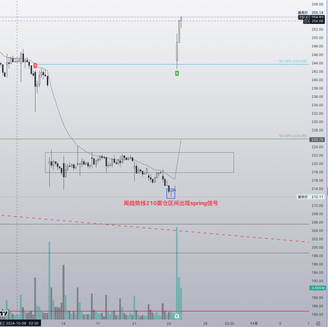 结合上图可以看出,此时210附近正是周趋势大三角形形态的趋势线回踩位,也就是210附近。同时,在1H级别,我发现经过一轮消息面不符合华尔街预期的利空抛售后,成交量的卖压并没有出现井喷,且一直在缩量盘整高,而是在疑似周趋势重要支撑位做终极震仓吸筹,并且出现了Wyckoff信号中的spring弹簧。此时,综合我的交易系统,分时图产生共振,形成了买入信号。