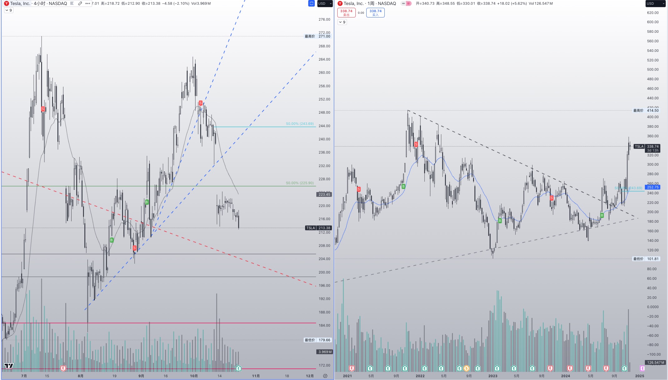 正股持仓只有 $特斯拉(TSLA)$ 和部分 $美国超微公司(AMD)$ 了,之前持有 $台积电(TSM)$ 和 $英伟达(NVDA)$ 等,但是最近都在逐步减仓的止盈,因为在我的系统的量化信号里面,短期出现了风险预警。且消息面上对于川普交易来说,市场因为通胀担忧再加上大盘跌了2%,抹去了川普当选一半的涨幅;另一方面是担心美联储的言论,每个官员的言论侧重点都在不清楚未来降息降到哪里,显得比较谨慎(这也是我主观认为的,希望基本面专业小伙伴给予我更多的学习参考)。所以,这也符合我的(信号 + 信息)共振风险初现(当然它也不是定性的,很可能我是错的)。我所能做的仅是量化我的亏损大小风险。