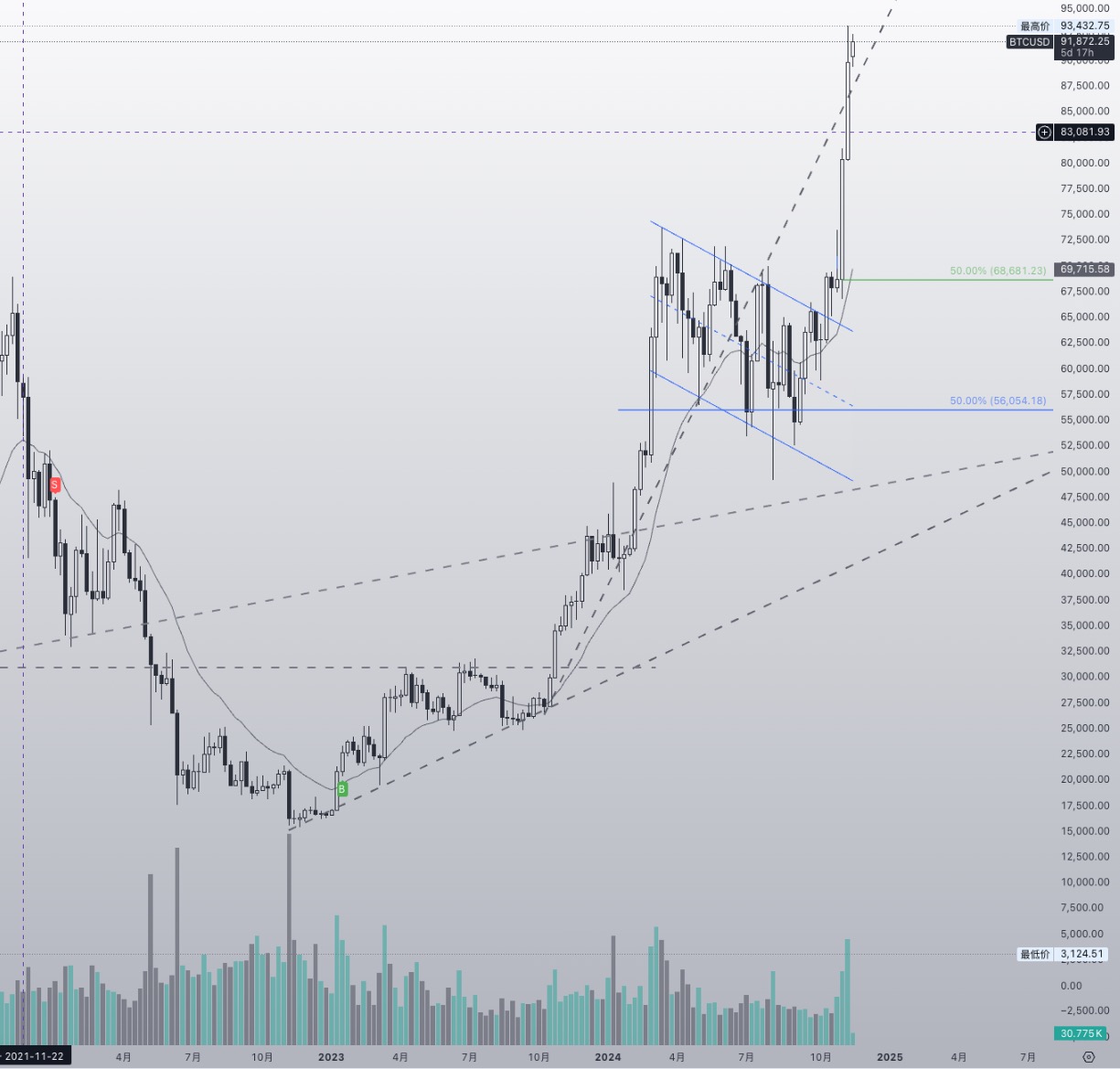 因为我本身是比特币的长期持有者,我在2023年6月末发现了美股突破大形态的转变,并在2023年10月17日通过分析方法提前判断牛市可能会开启。因此,我一直做币本位操作,采用动态对冲,确保我能够承受的心理波动范围内,持有核心资产穿越牛熊。同时,我也会在比特币技术和币股出现共振时,做币股的短期期权,以获取共振主升浪的加速度获益。 $MicroStrategy(MSTR)$ $Coinbase Global, Inc.(COIN)$ $GraniteShares 2x Long COIN Daily ETF(CONL)$