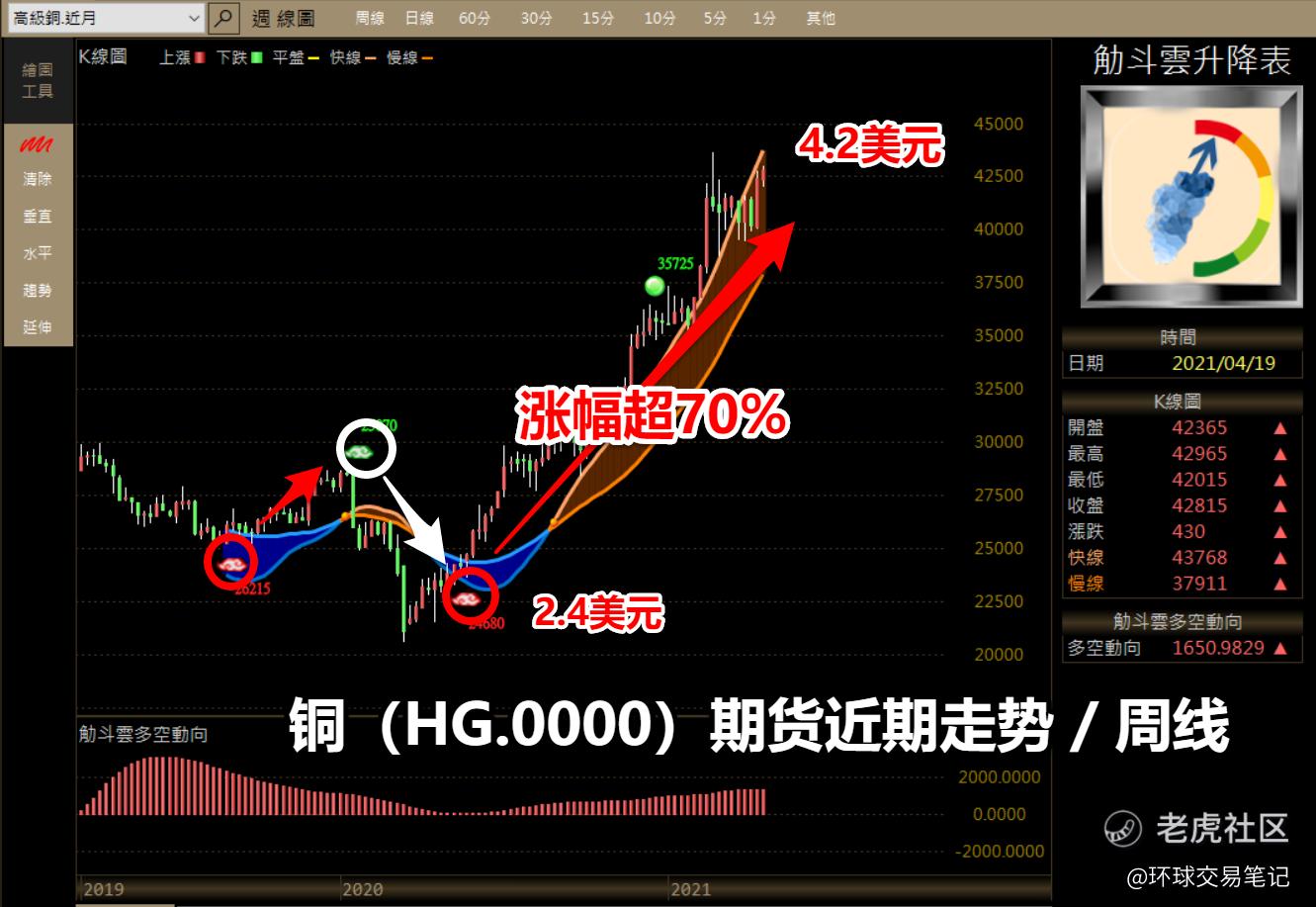 以上是长线预期,但在短线层级我们的观点则不同。透过观察铜期货周线,可以得知铜价是自去年中国发布新基建计划的时候开始上涨,其价格一路从2.4美元附近上涨至4.2美元附近,上涨超70%,幅度过大,是必要面临调整。因此,我们认为短线铜还是会以震荡行情为主,带到筹码经过一轮整理,才有可能继续爆发。