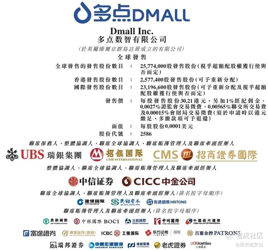 据悉,多点数智本次全球发售的发售股份数目为25,774,000股发售股份(视乎超额配股权获行使与否而定);香港发售股份数目为2,577,400股发售股份(可予重新分配);国际发售股份数目为23,196,600股发售股份(可予重新分配及视乎超额配股权获行使与否而定);发售价为每股发售股份30.21港元。