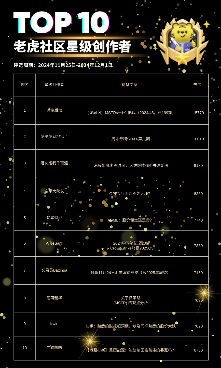 欢迎来到【星级创作者】奖励活动!在此活动中,我们每周都会向获奖创作者发布丰厚奖励哦[财迷][财迷]。此外,获得星级创作者徽章,还可享受社区专属流量激励与虎币奖励[你懂的]