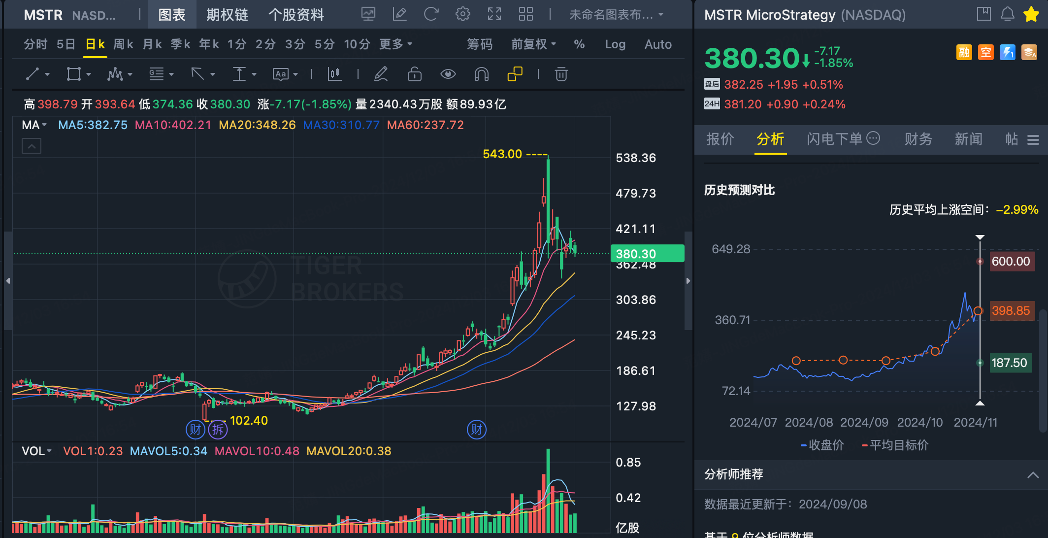 本期我们讲一讲最近比较妖的一个股票: $MicroStrategy(MSTR)$ ,这个与比特币深度挂钩的股票,前段时间受比特币价格暴涨的影响,股价一路高歌猛进,短短一个月上涨了58%,然而进入12月份之后,股价一直处于350到420之间宽幅震荡。