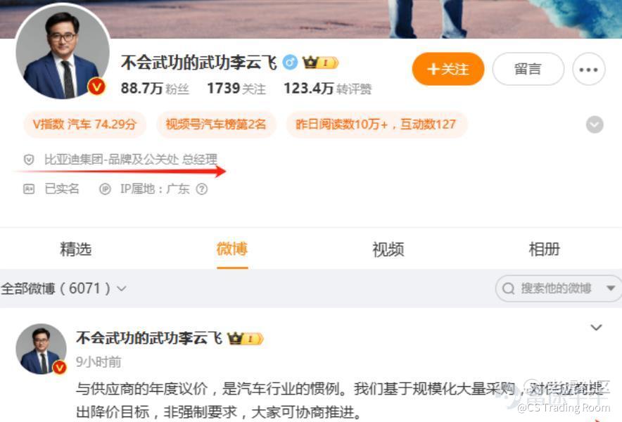 但不管怎么样,这件事情影响程度有点大,比亚迪品牌和公关部总经理,赶紧在社交平台发文解释:“与供应商的年度议价,是汽车行业的惯例。我们基于规模化大量采购,对供应商提出降价目标,非强制要求,大家可协商推进。”