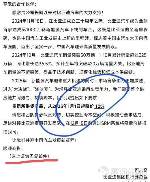 最开始,是有封比亚迪发给供应商的邮件被流传出来: