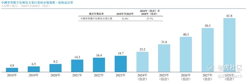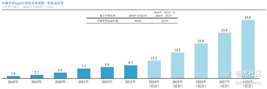 多点数智所处行业为零售数字化行业及零售SaaS行业,这个两个行业随着利好政策、完善的云基础设施及不断增长的数字化需求,近年来市场规模不断扩大。2023年,零售数字化行业的市场规模达到187亿元人民币,2018-2023年复合年增长率高达31%,预计2028年将达到人民币618亿元。SaaS行业2023年市场规模为90亿元人民币,复合年增长率高达40%,预计2028年将达到人民币434亿元。目前,公司是中国最大的零售数字化解决方案服务商,拥有6.5%的市场份额。所处两个行业现在都处于告诉发展的阶段,公司也随着市场规模的扩大而业务规模、营收不断扩大。