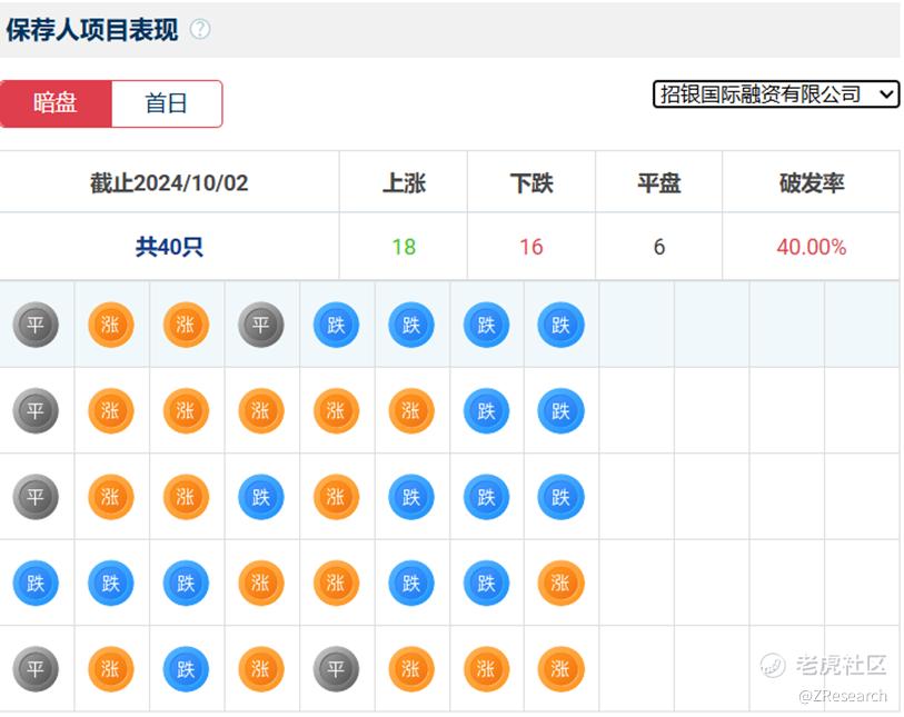 招银国际历史上作为保荐人参与了40个项目,其中暗盘有18家公司上涨16家公司下跌,破发率40.00%。
