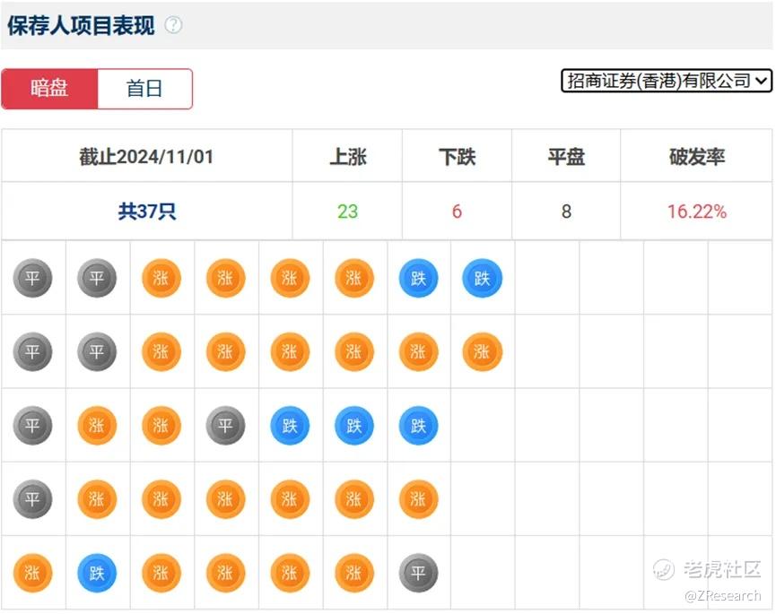 招商证券历史上作为保荐人参与了37个项目,其中暗盘有23家公司上涨6家公司下跌,破发率16.22%。